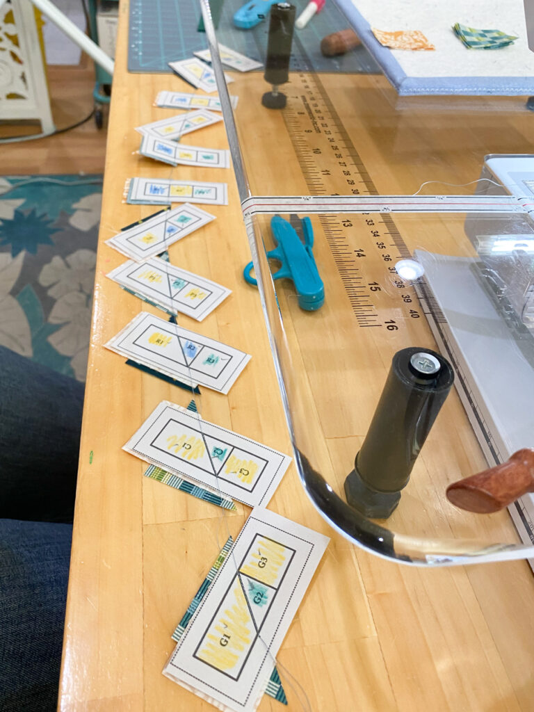 I’ve also started using a wooden seam roller instead of an iron to press as I go. It’s quick and keeps my paper pieces from getting too warped. I’m using a dab of glue to secure the first fabric piece in each unit too, it really helps keep things in place before stitching begins.