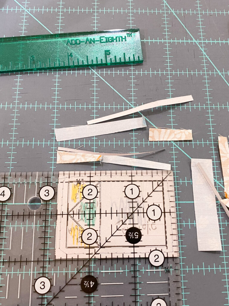 - Use an Add-An-Eighth ruler to trim off excess fabric, and give yourself a straight edge for placement of the next piece.