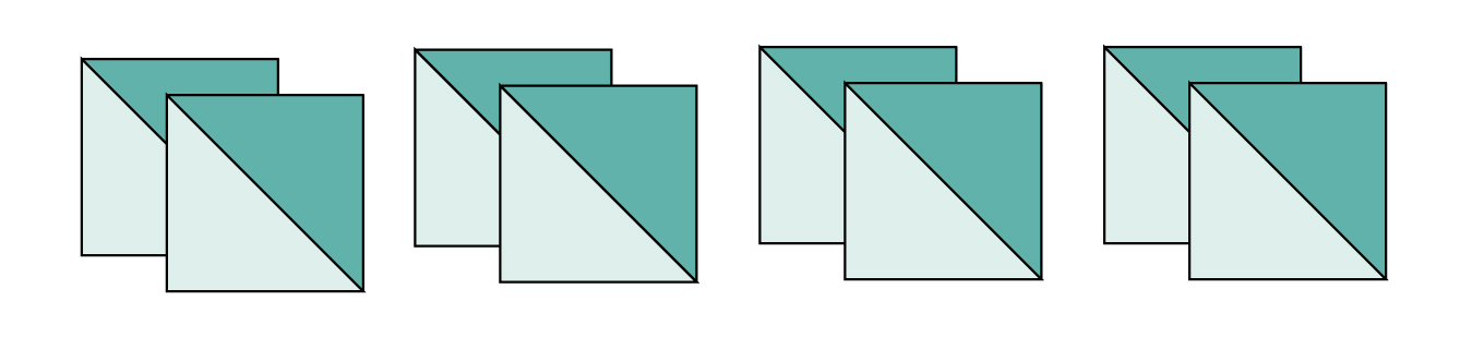 - Place (1) A – square with (1) B – square, right sides together. Sew 1/4” away from both sides of the drawn diagonal lines. Cut the square in half twice vertically and horizontally (to form four smaller squares), then cut along drawn diagonal lines, making (8) half square triangles.