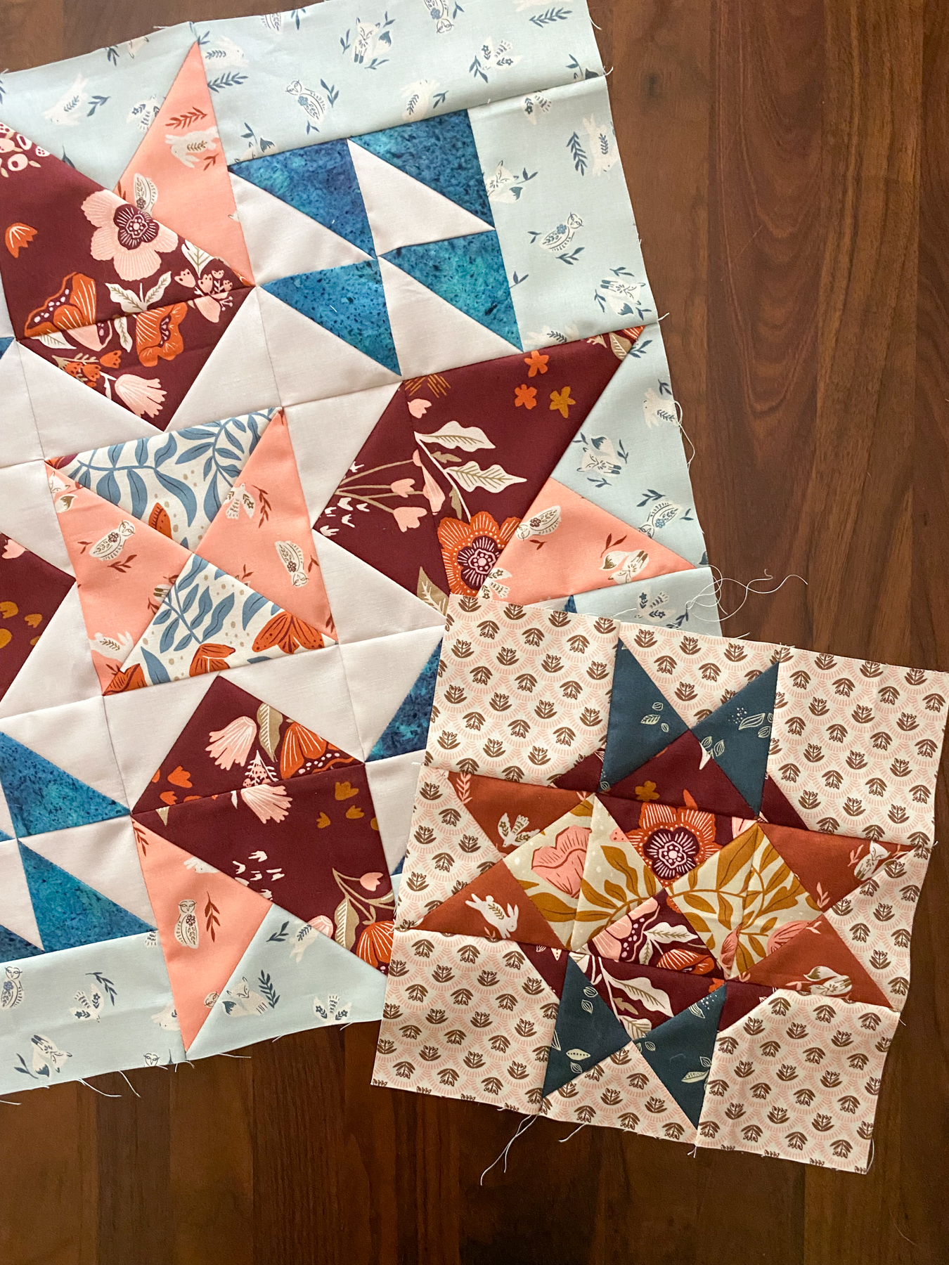 This block came together beautifully using quarter-square triangle units and a few stitch-and-flip units. Sherri shared a video where she made it using all the same fabric for the star points (fabrics B and D). I followed the original pattern and used two different fabrics for the star points—blue and brown—from Folk & Lore by Fancy That Design House.