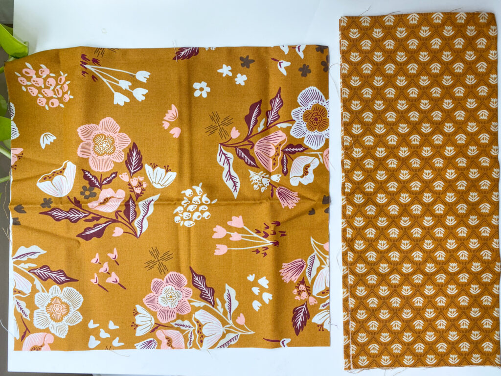 For the center star, I chose two of the golden tone fabrics from the Folk & Lore bundle by Fancy That Design House. I fussy cut a flower for the center, and used a smaller blender print for the star points.