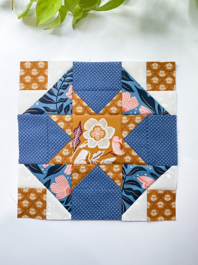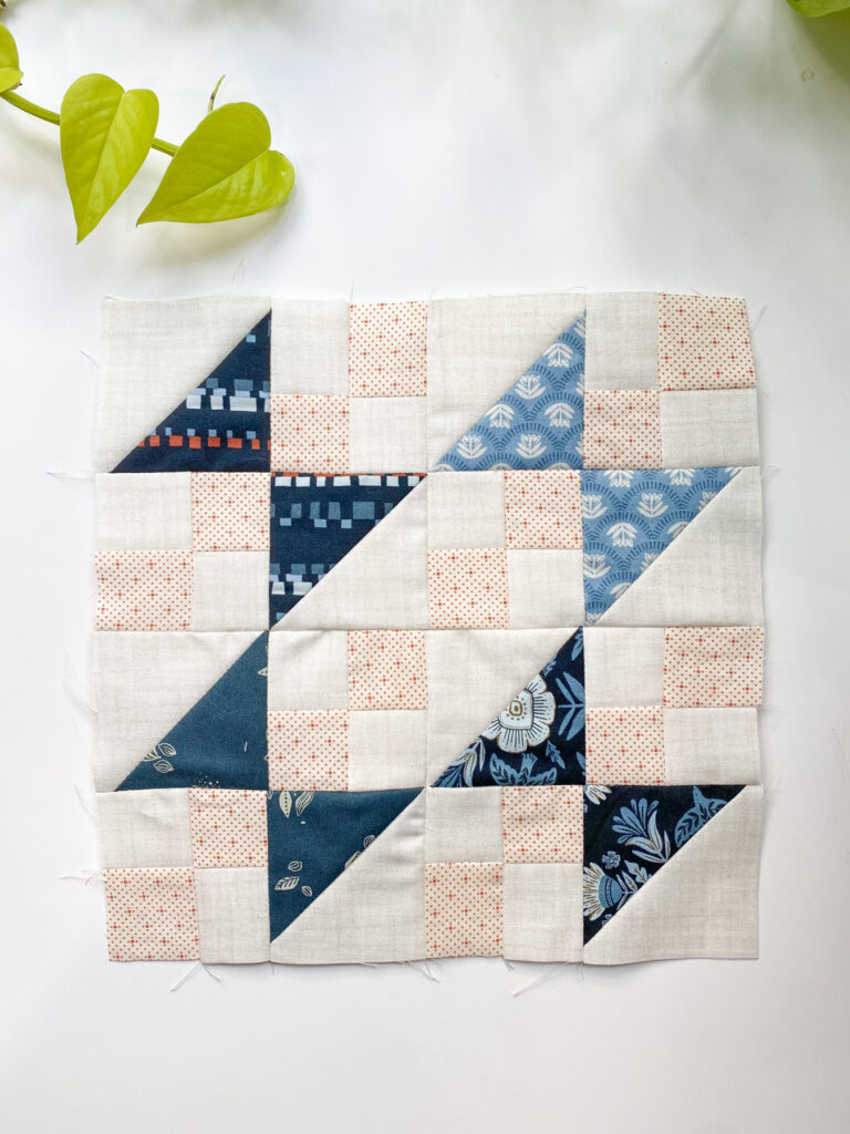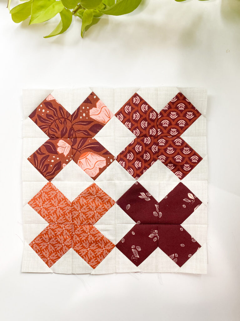 This block is just too cute! I decided it was time to bring in more of that burgundy/rusty orange into my quilt, so I pulled four different prints in that colorway. I’m super happy with how this one turned out, it adds such a warm touch to the mix.
