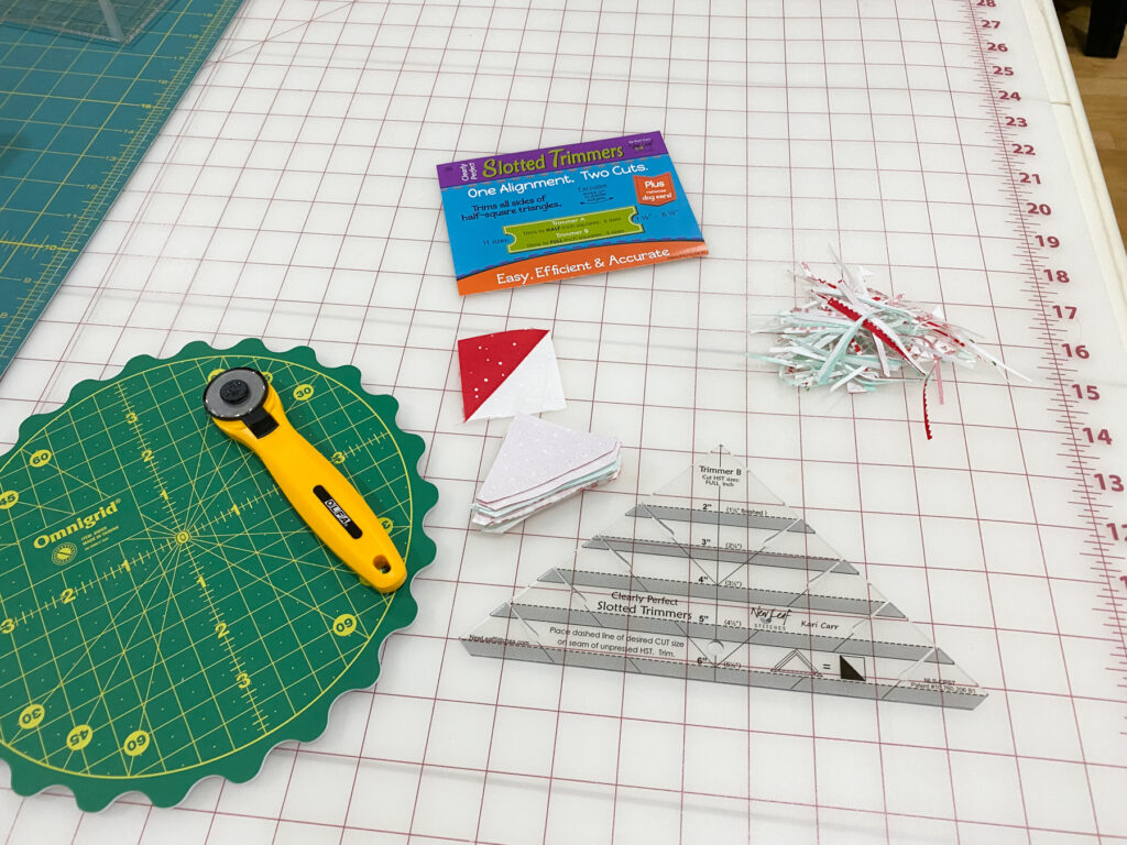 Grab your favorite half-square triangle ruler for this one! My go-to is the Bloc-Loc, I get really precise results with it. I tried another HST ruler this week after hearing good reviews, but my units ended up about 1/8 inch too small after pressing (maybe I’m doing something wrong?) I’ll keep experimenting, but for now, Bloc-Loc remains my favorite.